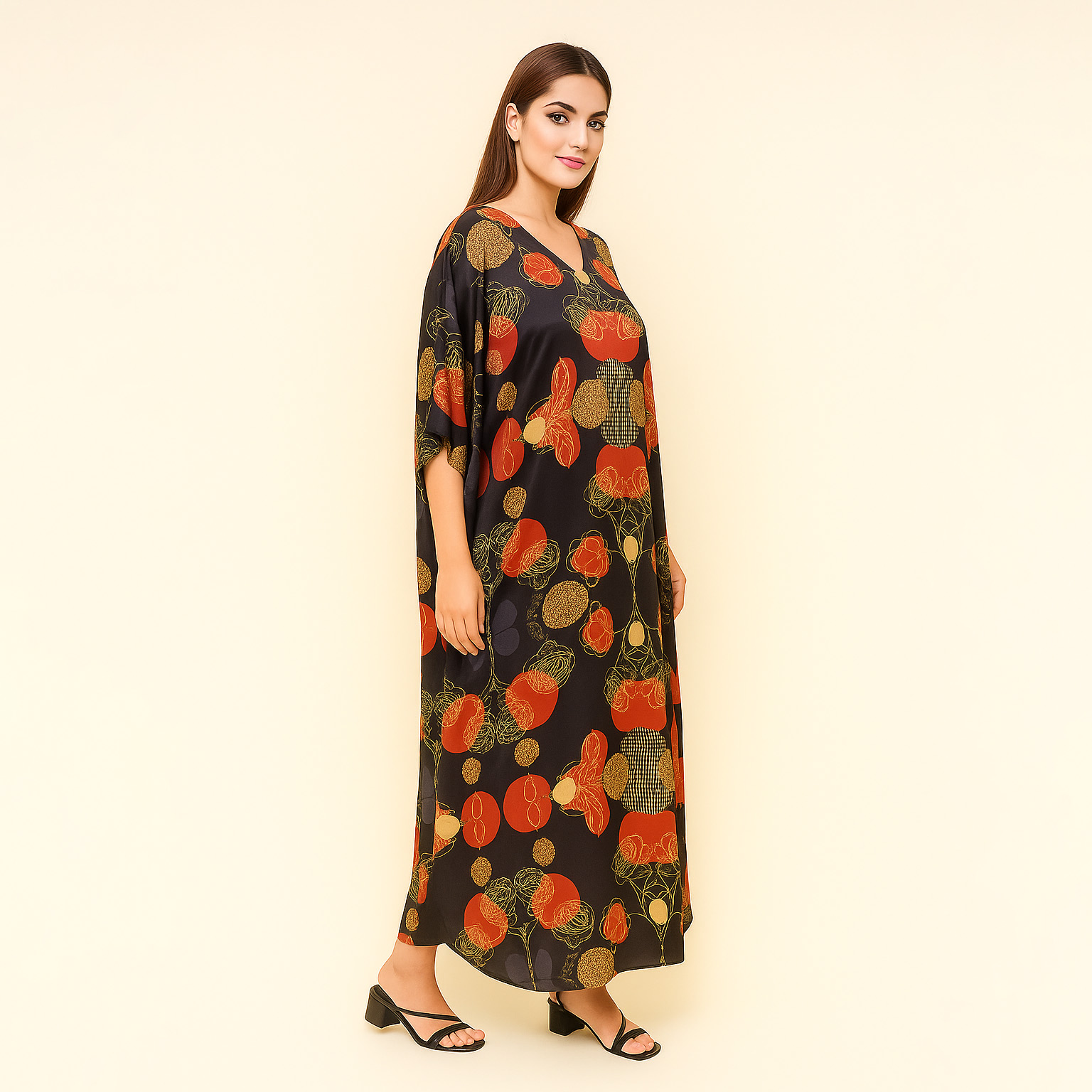 This black silk kaftan dress is designed to make everyday dressing simple yet stylish. The floral abstract motifs against a dark backdrop bring depth to the flowing satin silk, making it a versatile choice for casual wear or travel.